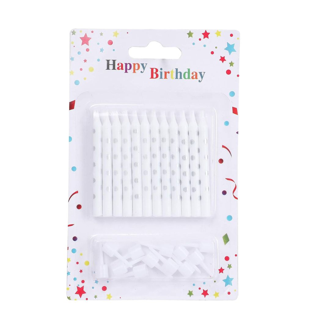 Features- Each white candle is meticulously adorned with metallic silver polka dots. With a set of 12, you'll have enough candles to light up multiple occasions.